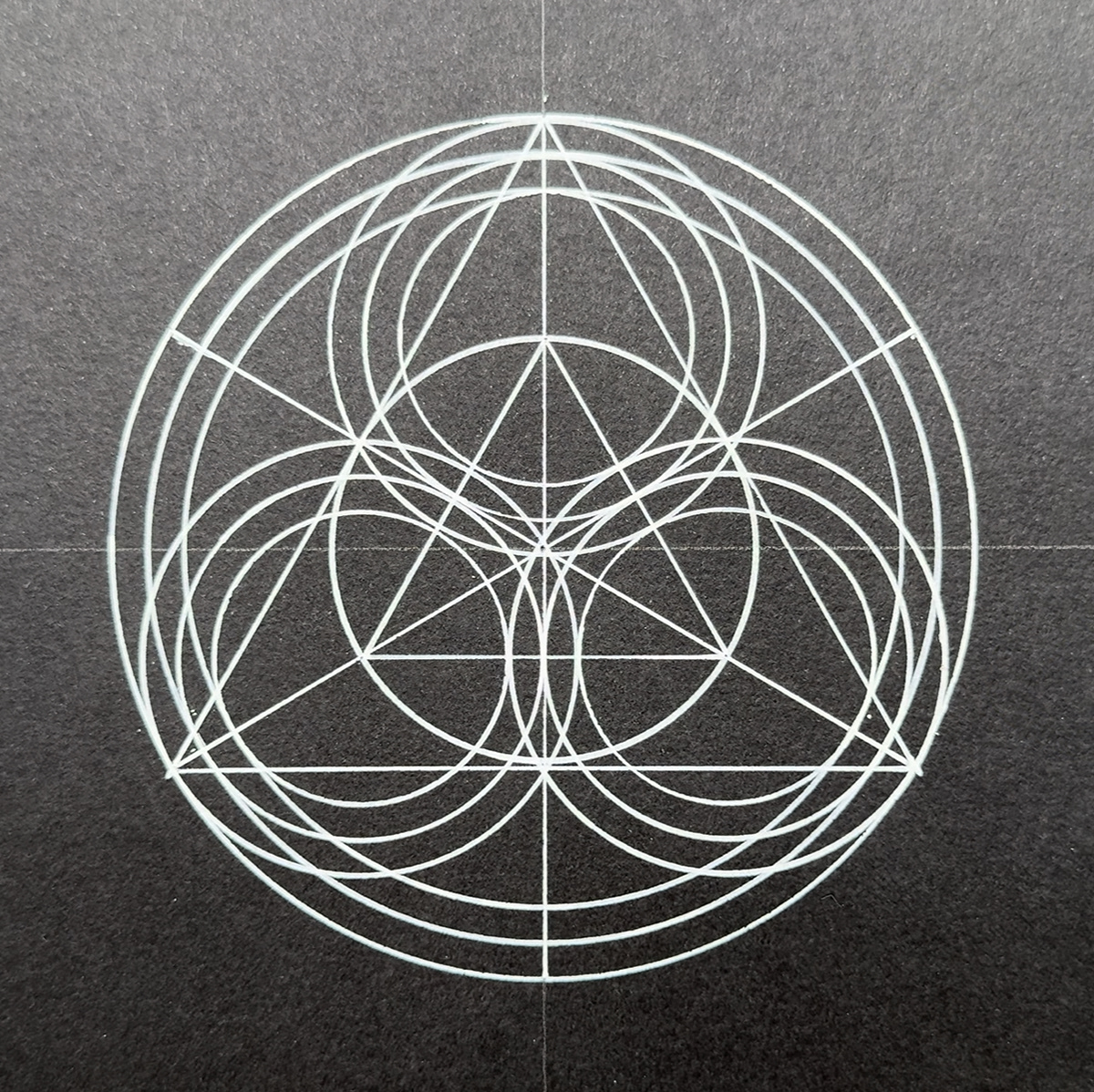 Separately, I would like to note the relationship between the incircle and circumcircle of an equilateral triangle: together they form a visual analogy to a musical octave, where the circumference of the inner circle is half the circumference of the outer one. Incidentally, this structure also appears at the foundation of tracery construction, which can be observed in the previous video.